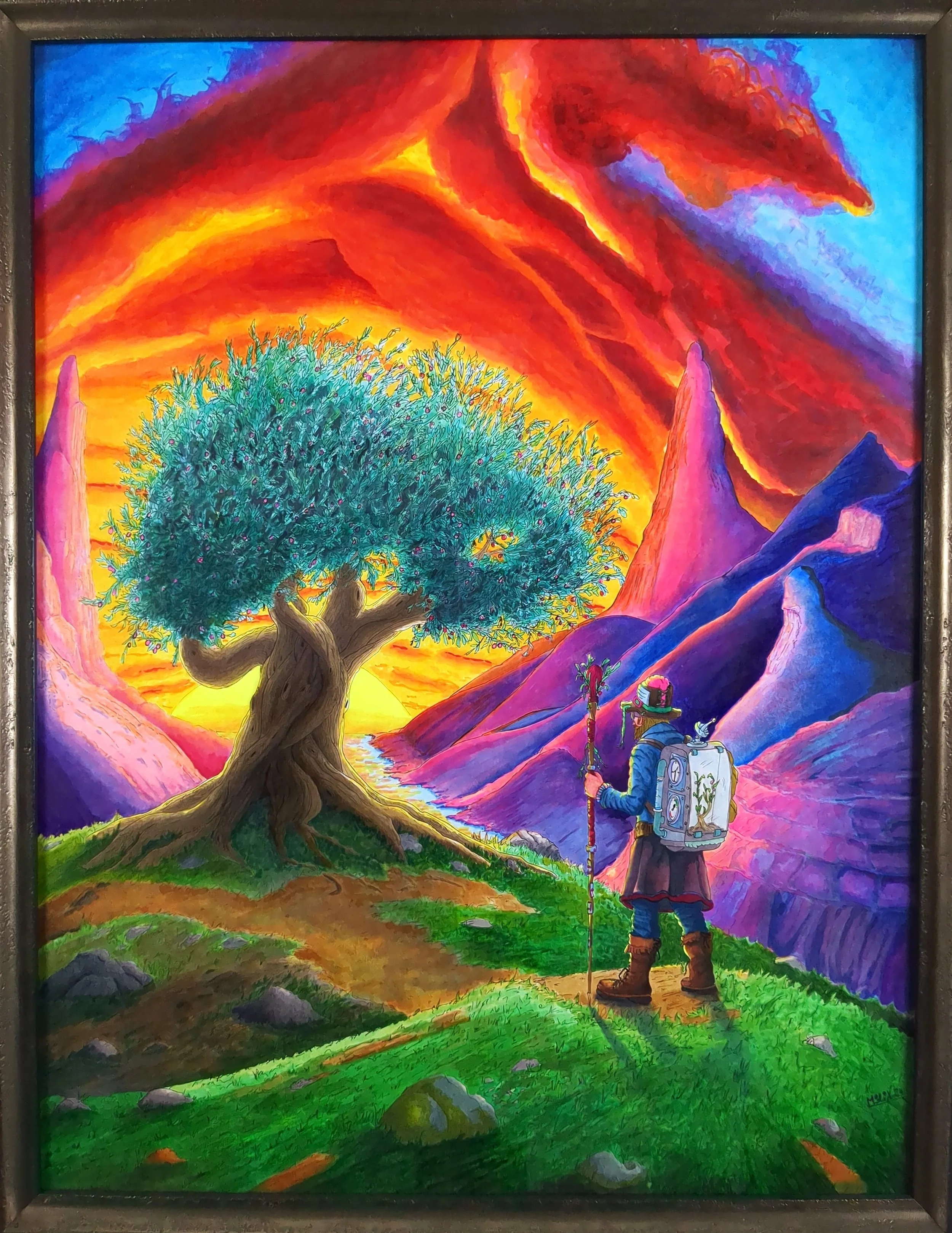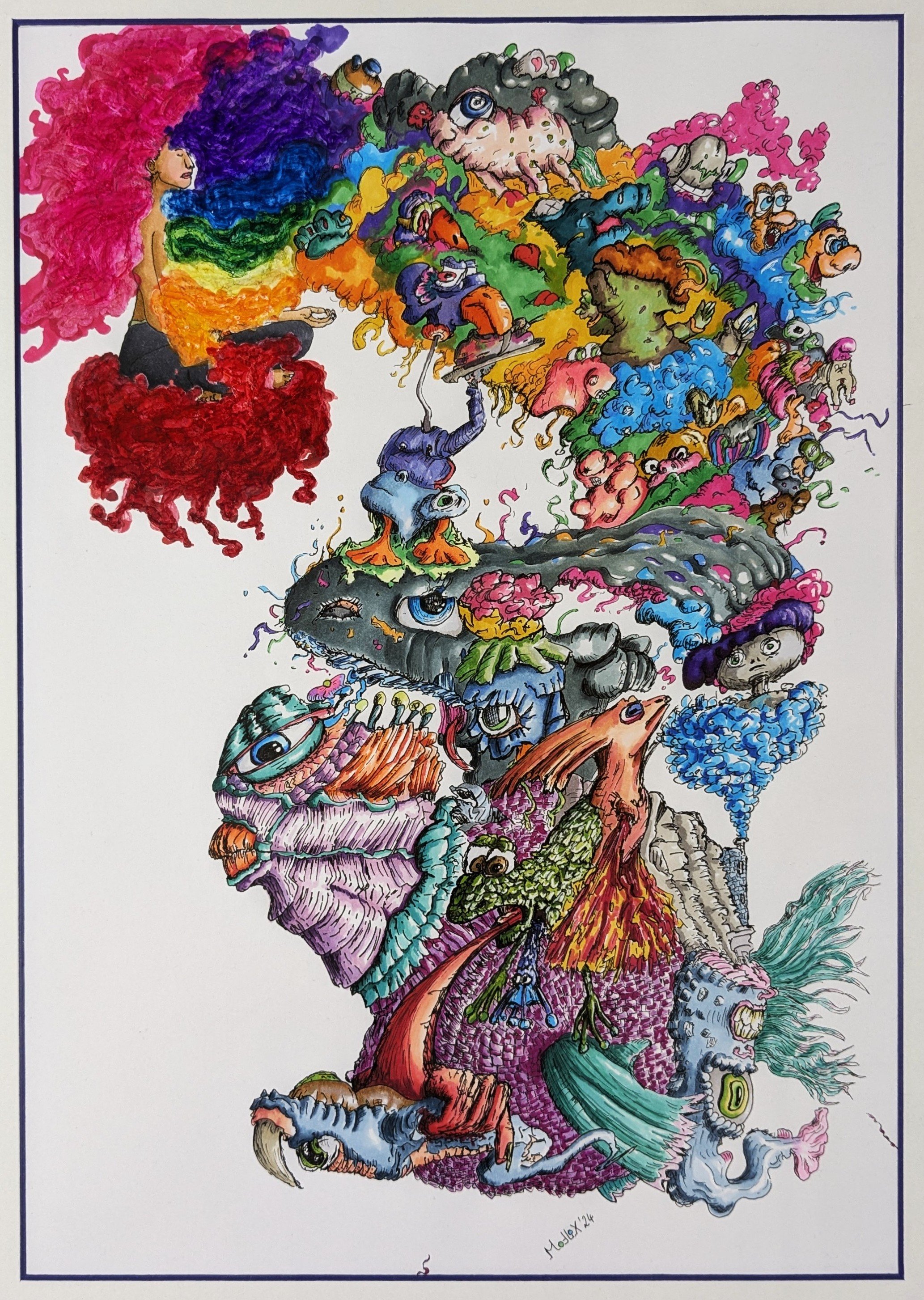 Meine Werke sind farbenfrohe Erzählungen über das Anhalten und den Mut der bewussten Auseinandersetzung mit dem Inneren. Die farbenfrohe Lebendigkeit und Detailfülle meiner Bilder lädt dazu ein, sich zu verlieren und gleichzeitig sich selbst zu finden, denn auch in der Dunkelheit ist Schönheit und Klarheit zu finden.